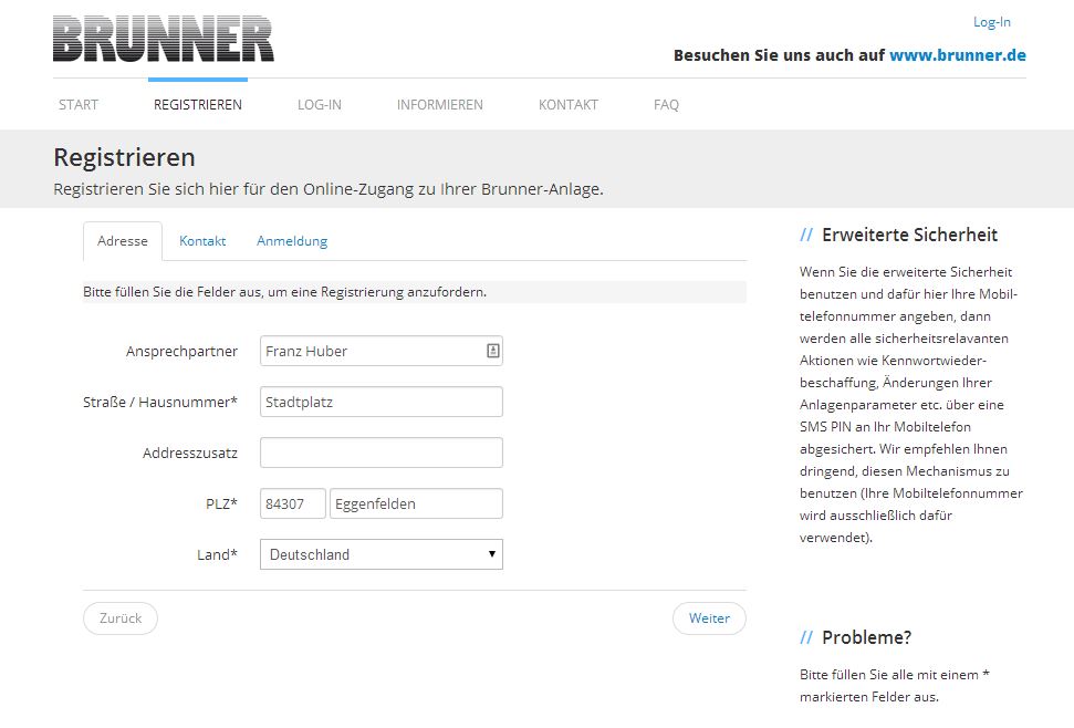 Der Online Zugriff auf eine bereits registrierte Anlage erfolgt immer über www.mybrunner.de. Mit Eingabe von Benutzername und Kennwort ist der direkte Zugang auf die eigene Anlage möglich.